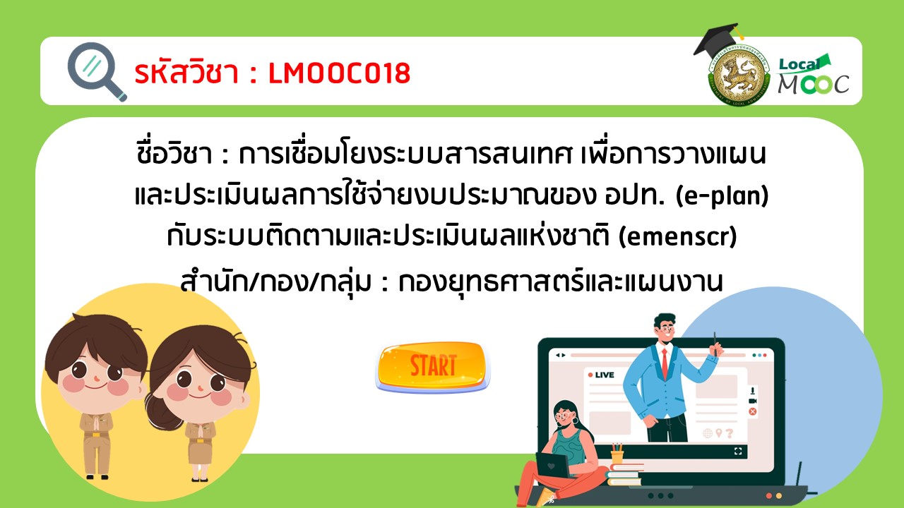 LMOOC018 : การเชื่อมโยงระบบสารสนเทศเพื่อการวางแผนและประเมินผลการใช้จ่ายงบประมาณของ อปท. (e-plan) กับระบบติดตามและประเมินผลแห่งชาติ (emenscr)