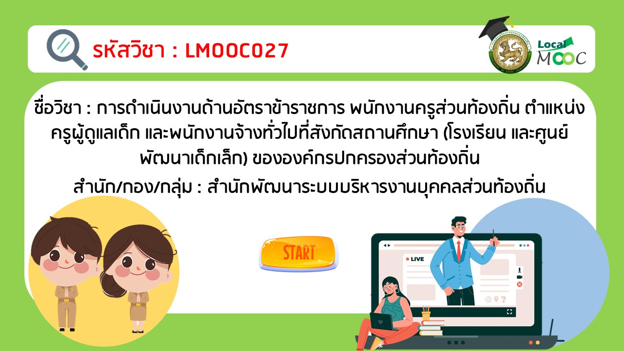 LMOOC027 : การดำเนินงานด้านอัตราข้าราชการพนักงานครูส่วนท้องถิ่นตำแหน่งครูผู้ดูแลเด็กและพนักงานจ้างทั่วไป ที่สังกัดสถานศึกษา (โรงเรียนและศูนย์พัฒนาเด็กเล็ก) ขององค์กรปกครองส่วนท้องถิ่น